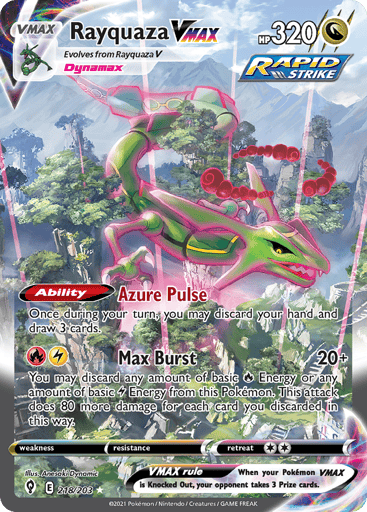 The most valuable card in Evolving Skies is Rayquaza VMAX, currently valued at $655.34.